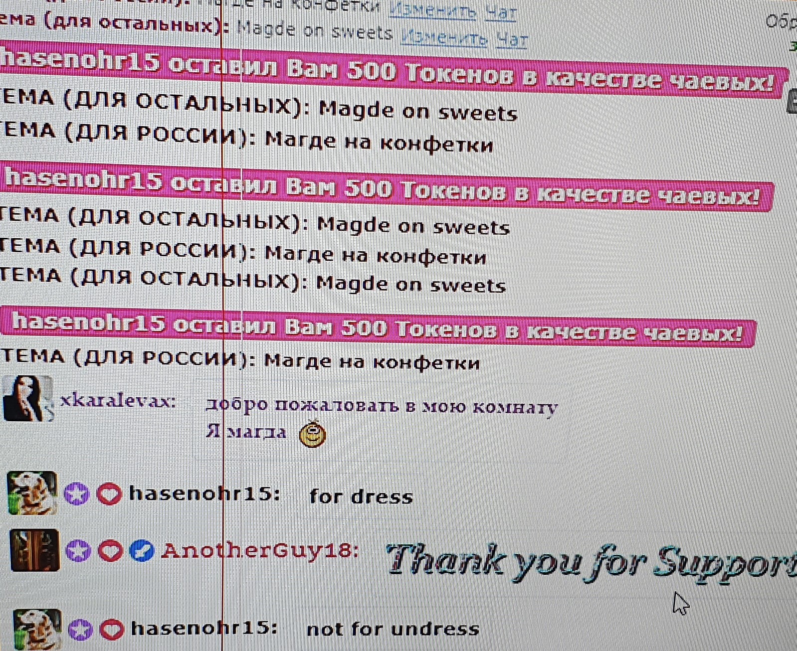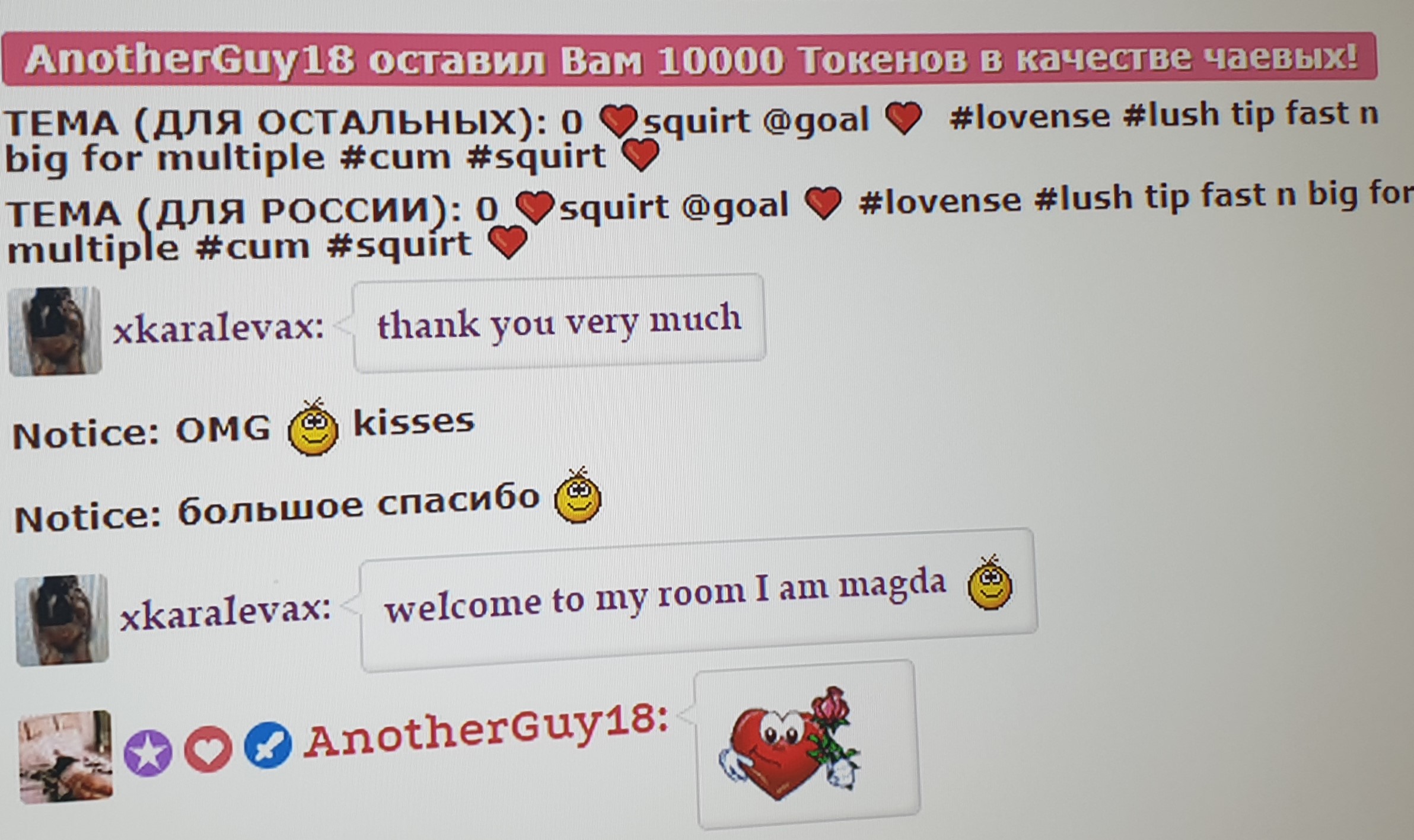 Genom att klicka på knappen kommer dy flytta xkaralevax till första plats på huvudsidan i 60 sekunder. Under denna tid kommer modellens chattrum att bli synligare och otroligt populärt! En notifikation om din åtgärd kommer synas i chatten och är synligt för modellen och övriga chattanvändare. xkaralevax kommer garanterat uppskatta denna gest och bli oerhört tacksam till dig!